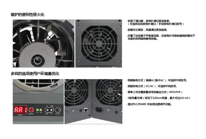 - 内置了自动离子平衡度回路,在放电针污染和磨损的情况下 也能长时间维持除电性能。